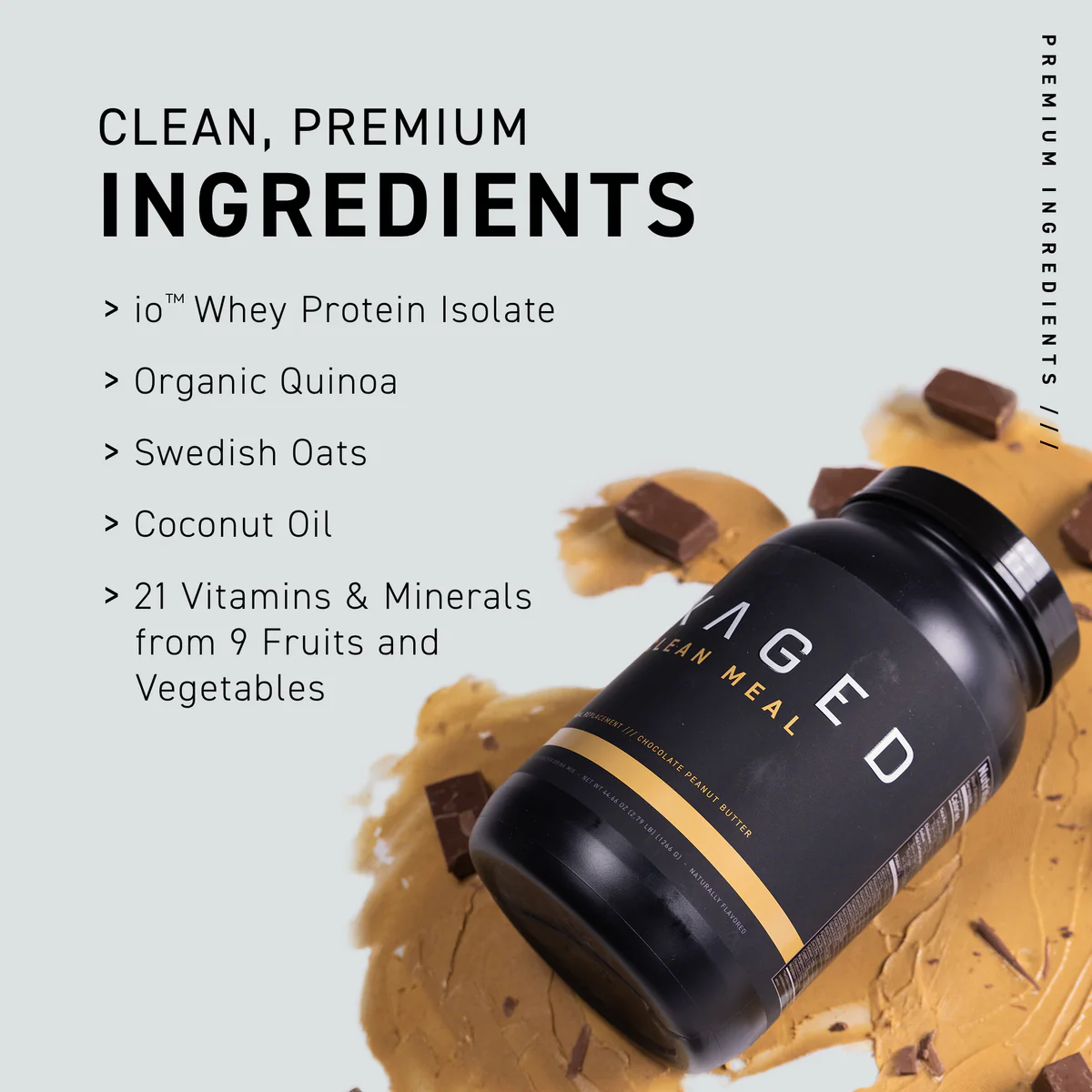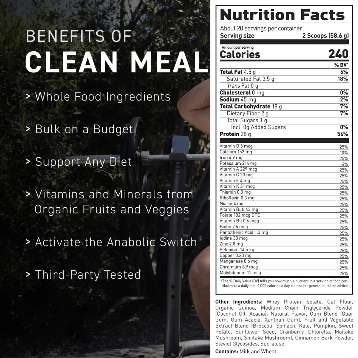 Clean Meal provides total nutrition powered by high-quality proteins, complex carbs, healthy fats, vitamins, and minerals. It leaves out the cheap fillers, artificial junk, and low-grade proteins found in typical meal replacements. We believe proper fuel requires clean, natural fuel.